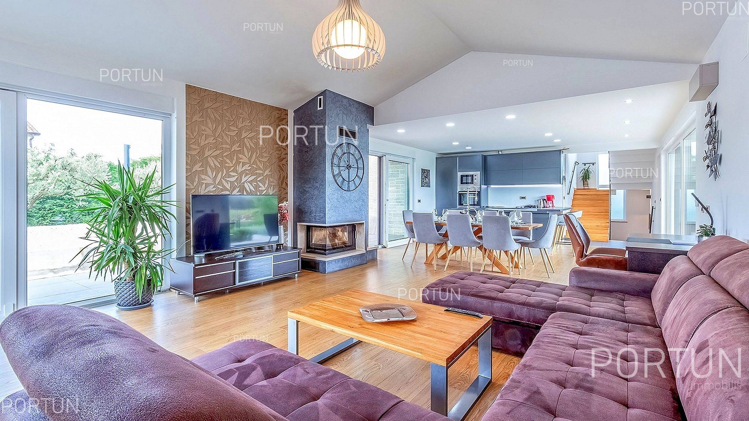 Dnevna soba s kuhinjo in jedilnico │ Pritličje ▪ Jugozahodna orientacija ▪ Izhod na nadkrito teraso ▪ Dnevna soba s kaminom ▪ Visoki stropi ▪ Velike steklene stene ▪ Usnjena sedežna garnitura ▪ Nizka miza ▪ TV ▪ Moderna razsvetljava ▪ Kuhinja v obliki črke U ▪ Opremljen z gospodinjskimi aparati ▪ Kuhinjski pult ▪ Pult z barskimi stoli ▪ Štedilnik ▪ Pečica ▪ Napa ▪ Pomivalni stroj ▪ Hladilnik z zamrzovalnikom ▪ Lesena miza ▪ 8 Stolov