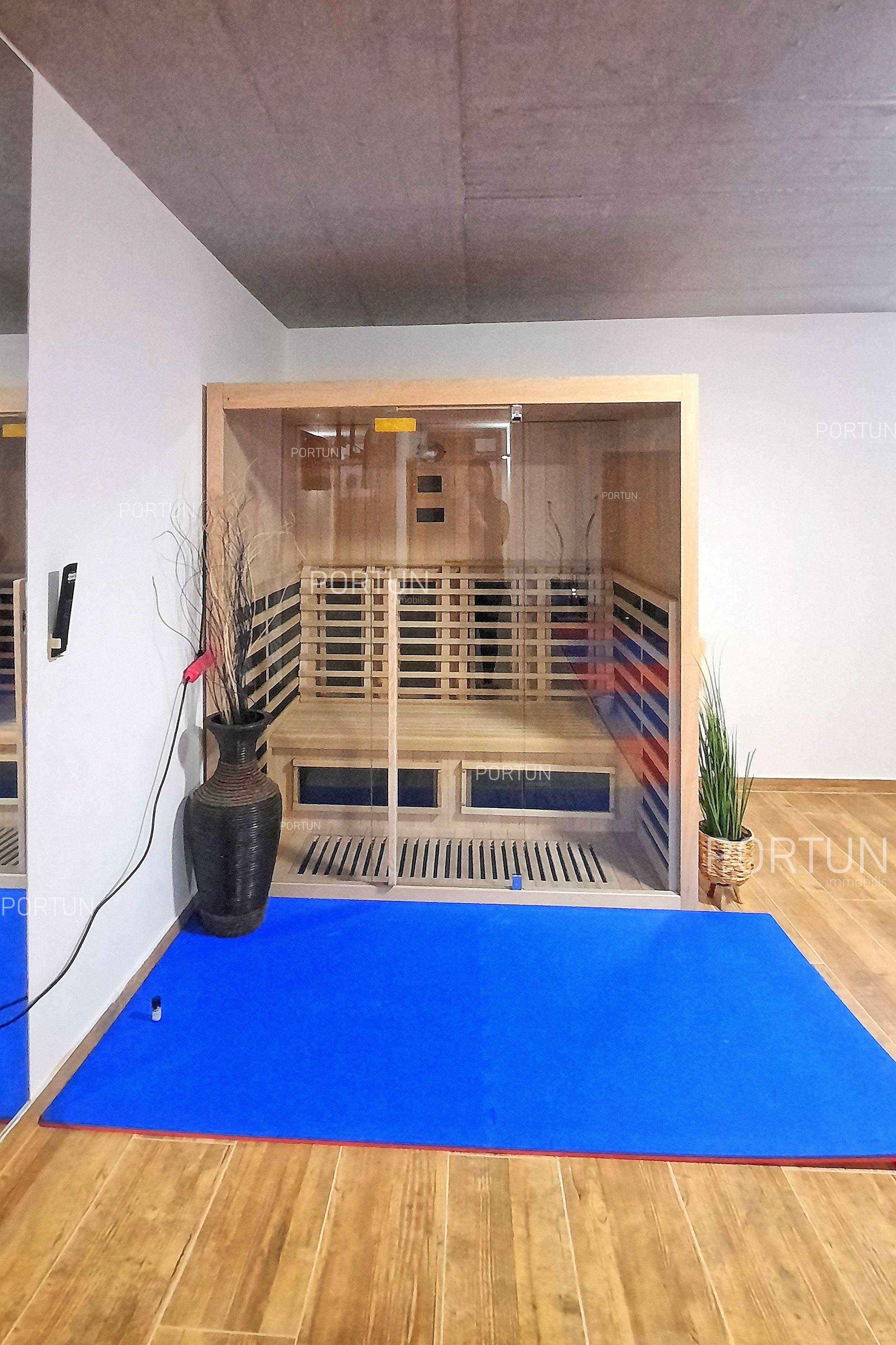 2 se nahajajo kuhinja z jedilnico, ena kopalnica, hodnik, fitnes in savna.